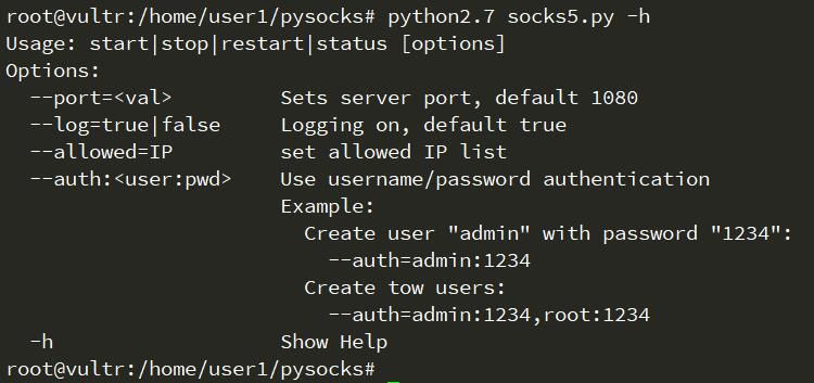 #?默認監聽0.0.0.0:1080端口 python2.7?socks5.py?start #?監聽0.0.0.0:8080端口并設置socks5代理的認證密碼 python2.7?socks5.py?start?--port=8080?--auth=admin:123456