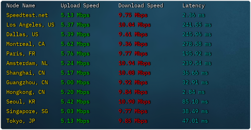 通過上圖可以很清楚的看到,不管是國外還是國內,上傳和下載都全部跑滿,足夠優秀。