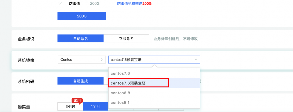 注意訂購時,操作系統必須選擇centos7.6預裝寶塔