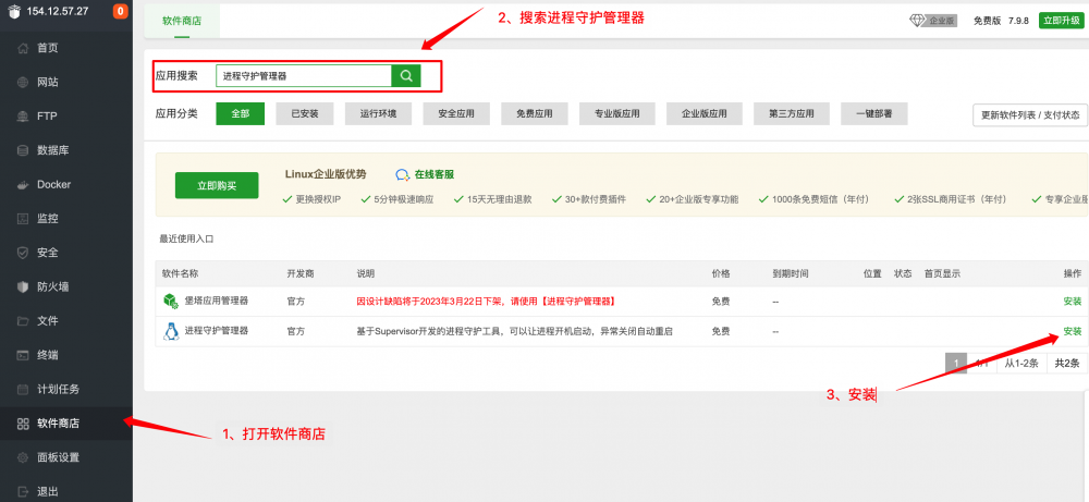 11、進入軟件商店,搜索進程守護管理器,點擊安裝,安裝最新版本就可以了