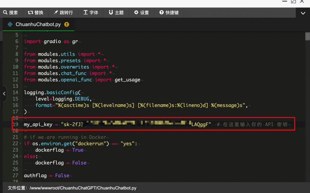 7、將你的ChatGPT key填寫到 第7行如下圖位置