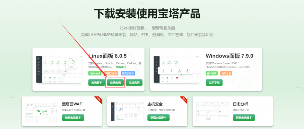3、訪問https://www.bt.cn/new/download.html 進入寶塔官網,點擊在線安裝