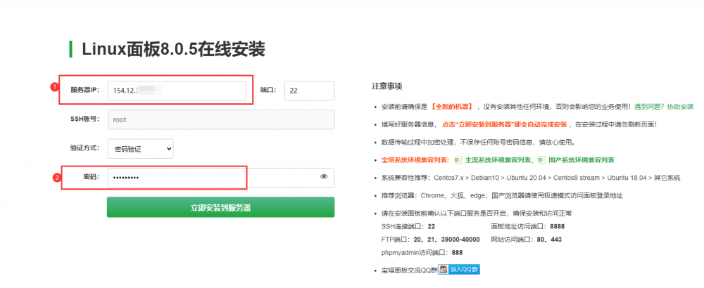 在這里我們輸入服務器的公網IP和系統(tǒng)密碼,點擊立即安裝到服務器。
