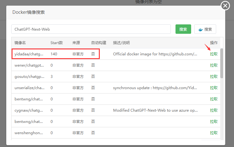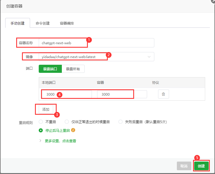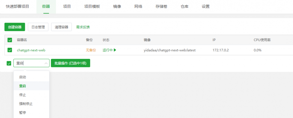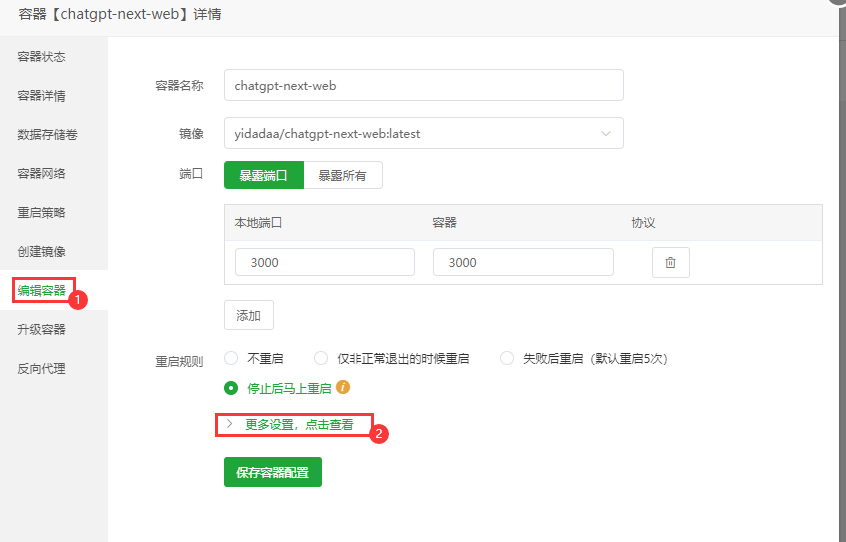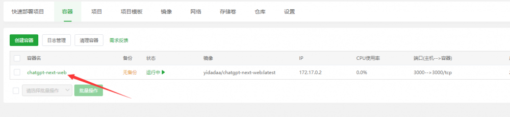 容器名稱任意輸入,我這里輸入的chatgpt-next-web,鏡像選擇剛剛拉取的yidadaa/chatgpt-next-web:latest