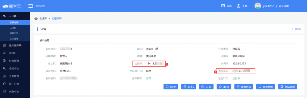 2、購買完成后,進入藍米云控制臺-云計算-云服務器,找到你的服務器,點擊右側的管理