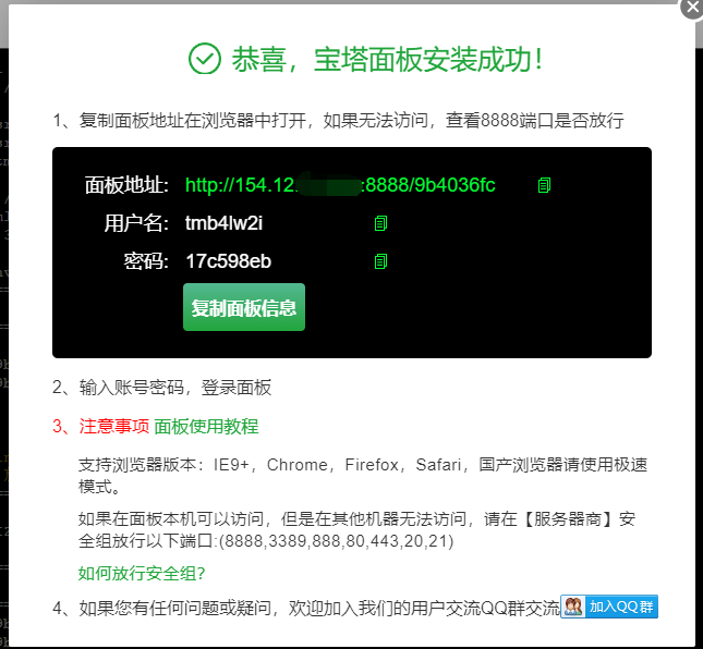 4、等待安裝完成后,會顯示面板地址、用戶名、密碼,請務必保存好,后續(xù)管理服務器需要用到。