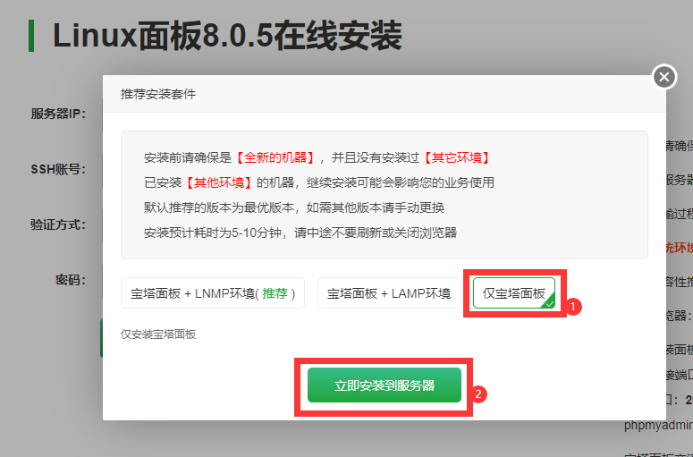 然后會彈出一個信息框,這里我們選擇僅寶塔面板,然后再點擊立即安裝到服務器