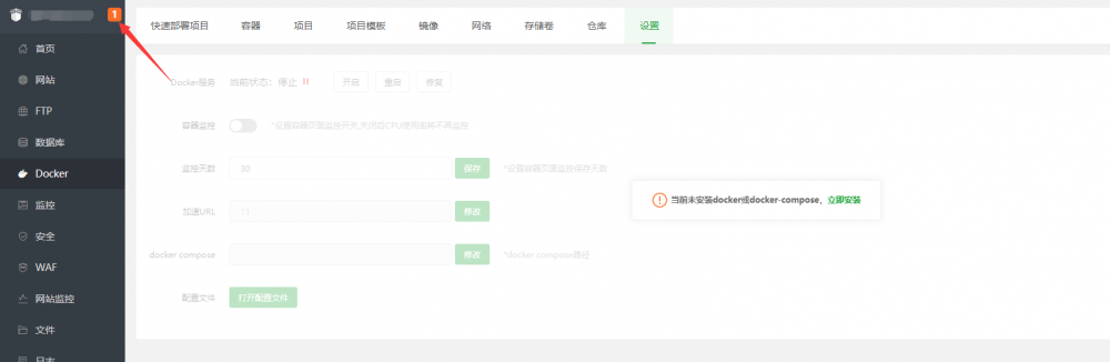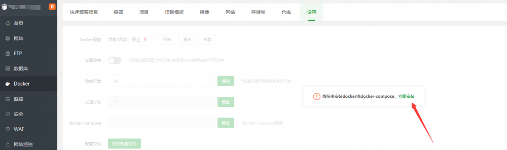 5、點擊寶塔面板左側的docker,第一次打開會提示安裝docker,我們點擊立即安裝。