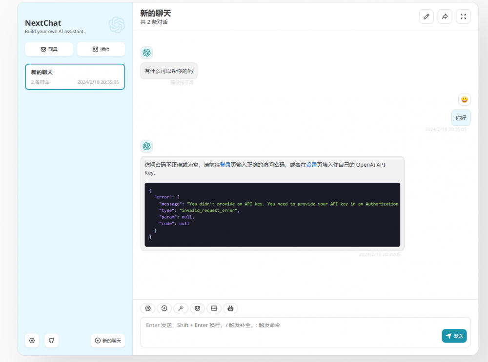 7、搭建ChatGPT現(xiàn)在已經完成了,訪問:http://你的公網IP:3000 就可以看到已經出現(xiàn)了ChatGPT的界面,但是發(fā)送內容會提示輸入密碼或設置OpenAI API key