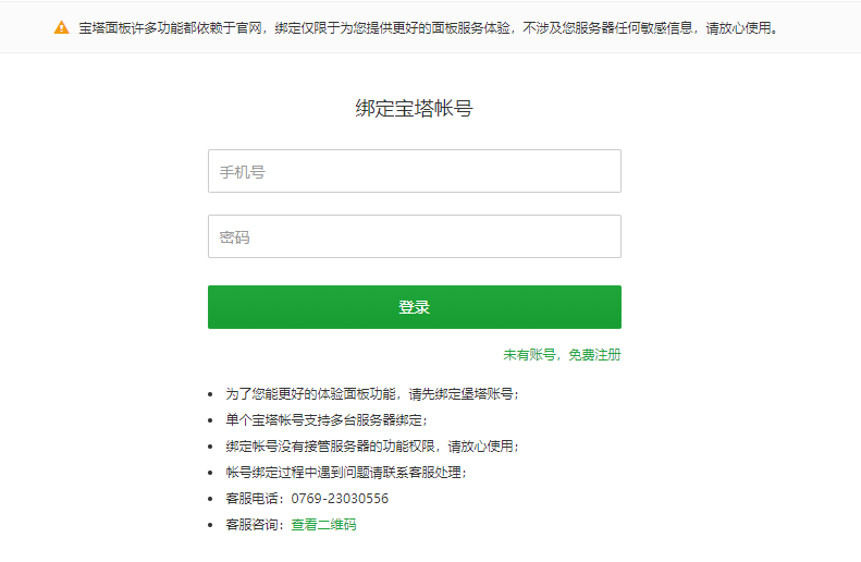 登錄面板后,首次會提示綁定寶塔賬號,這里的寶塔賬號不是剛剛的面板賬號,而是寶塔官方的賬號,如果你沒有的話,點擊下面的免費注冊,注冊一個賬號,再進行綁定就可以了。